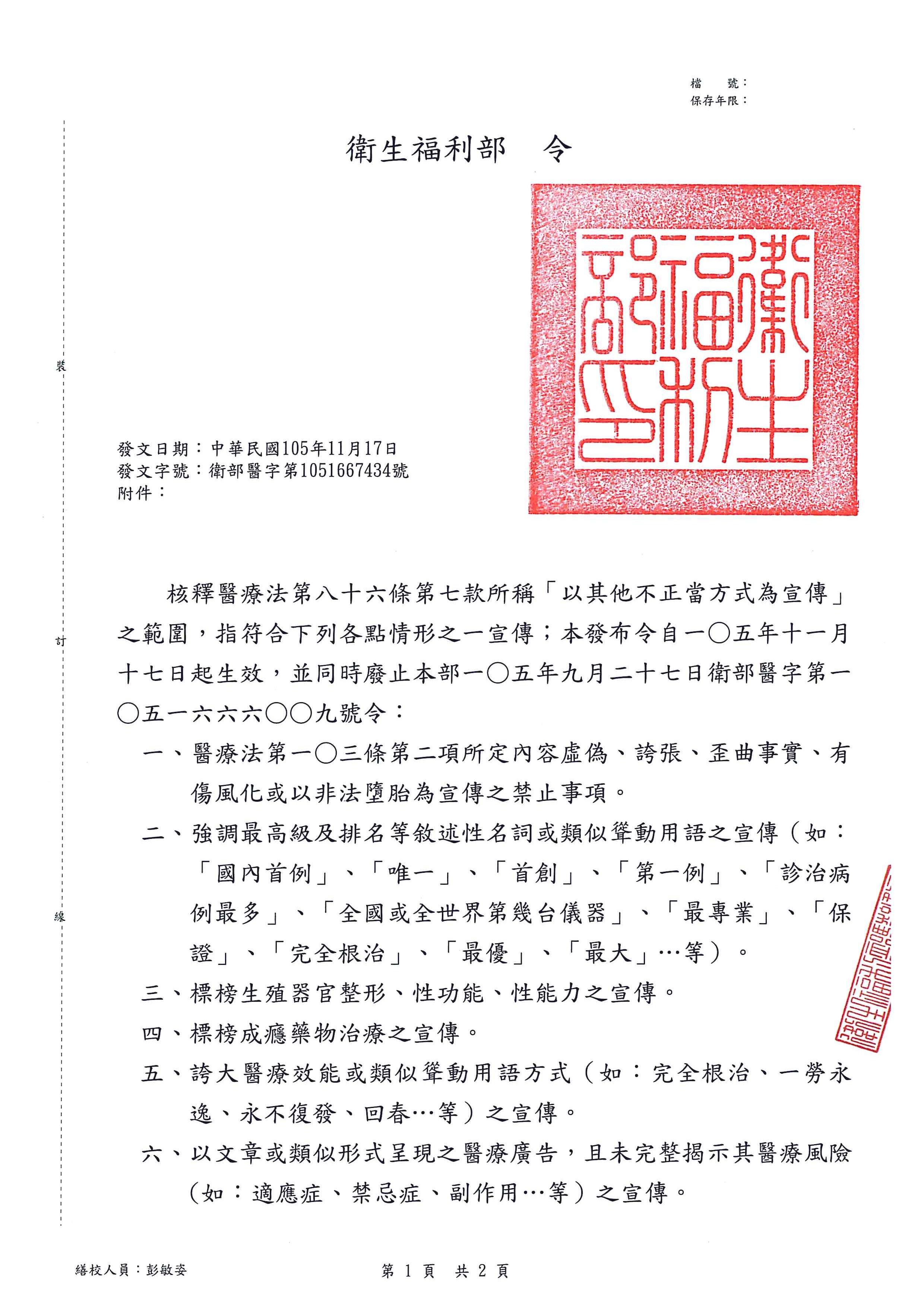 醫療法第86條第7款所稱「以其他不正當方式為宣傳」業經衛福部部105年11月17日以衛部醫字