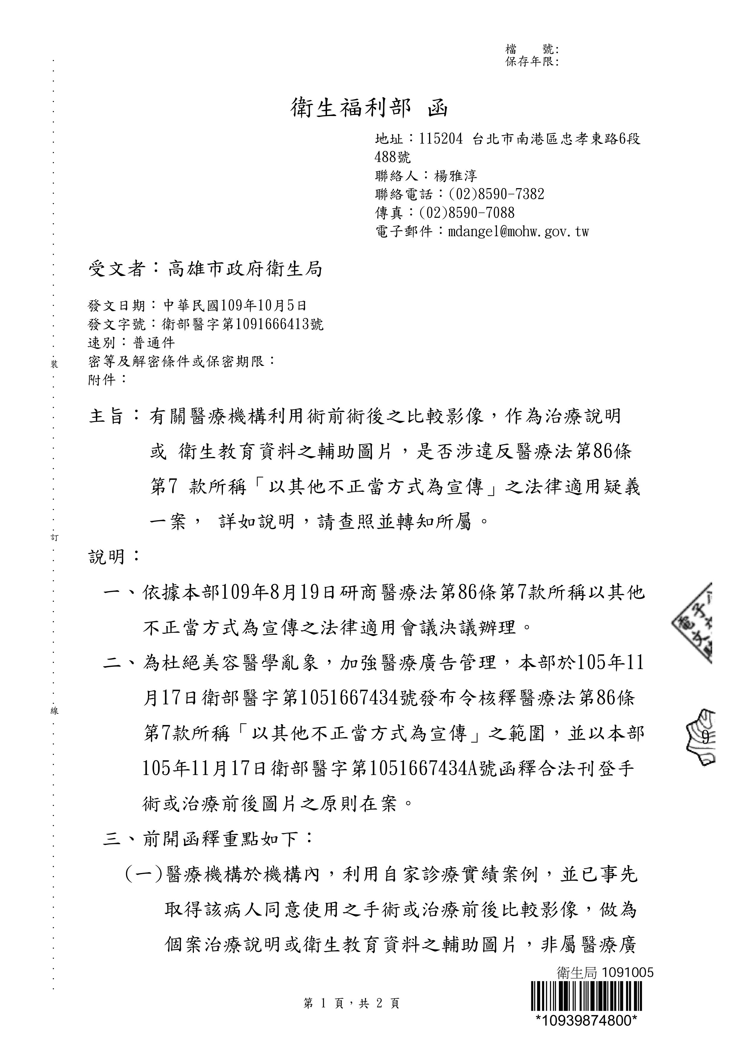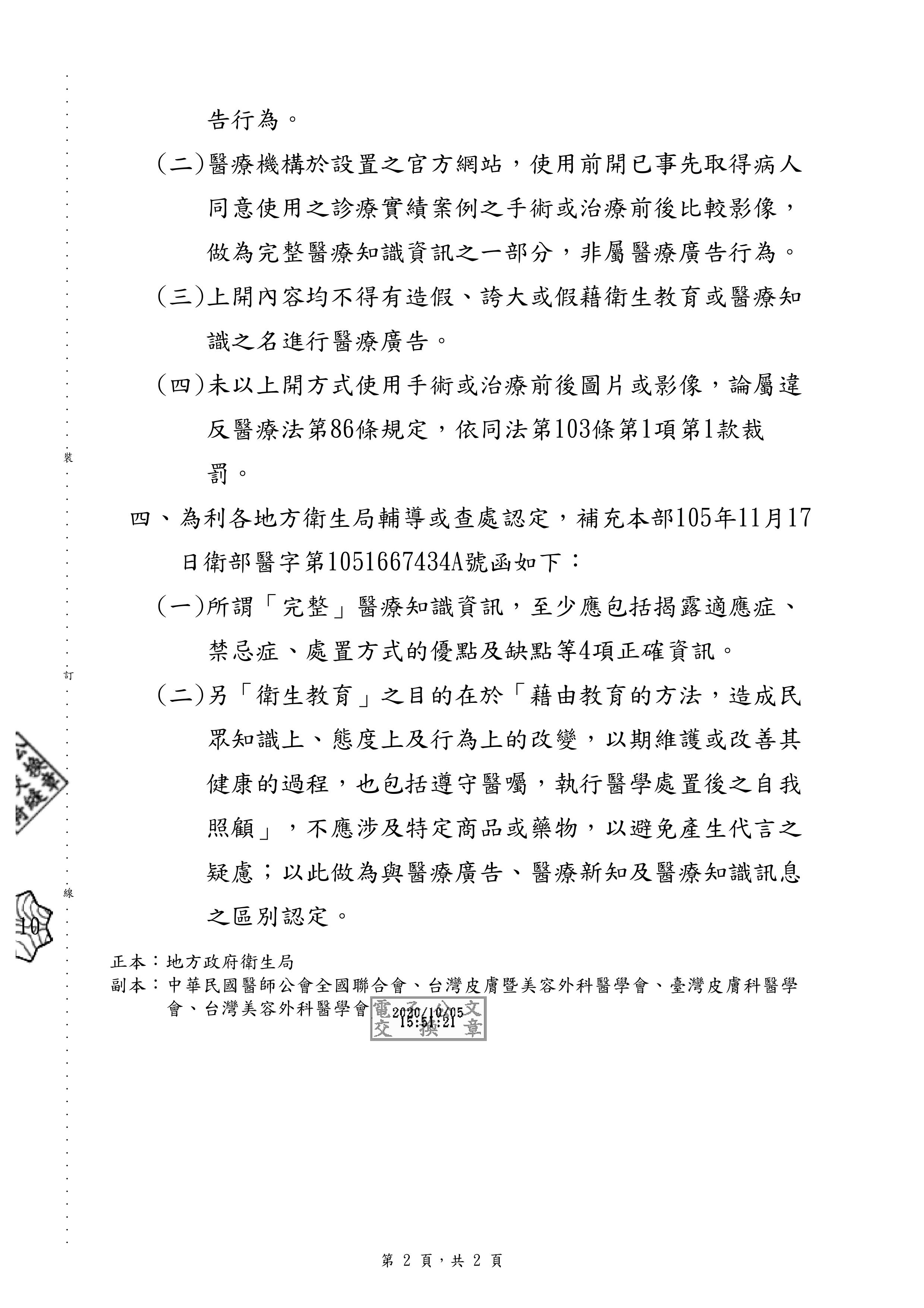 衛福部函釋醫療機構利用術前術後比較影像作為治療或衛教用途輔助圖片是否違反醫療法