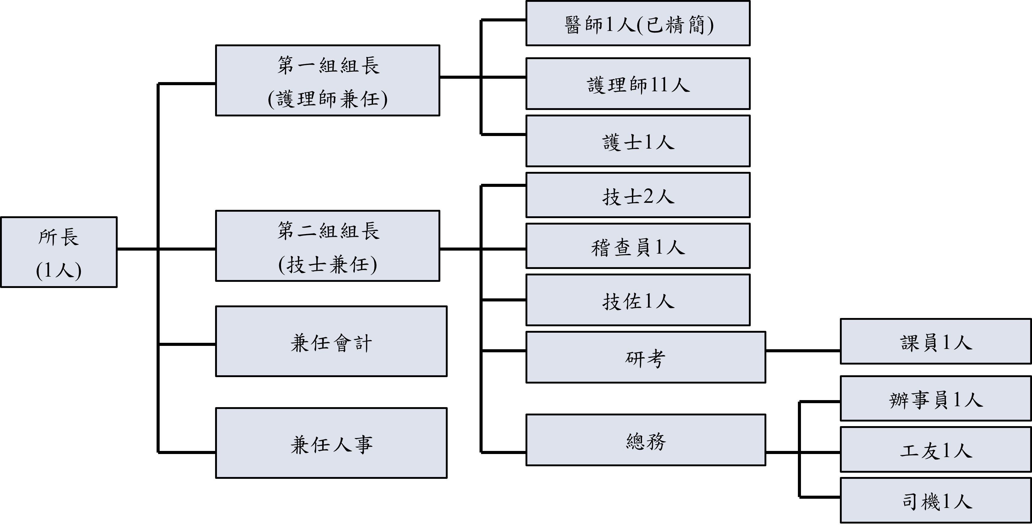 第三層:第一組、第二組、總務、研考、人事、會計業務